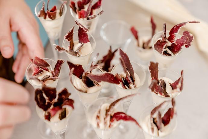 Lägg smöret i en spritspåse och spritsa upp det i snapsglas på fot som du sen sticker ner torrköttet i.